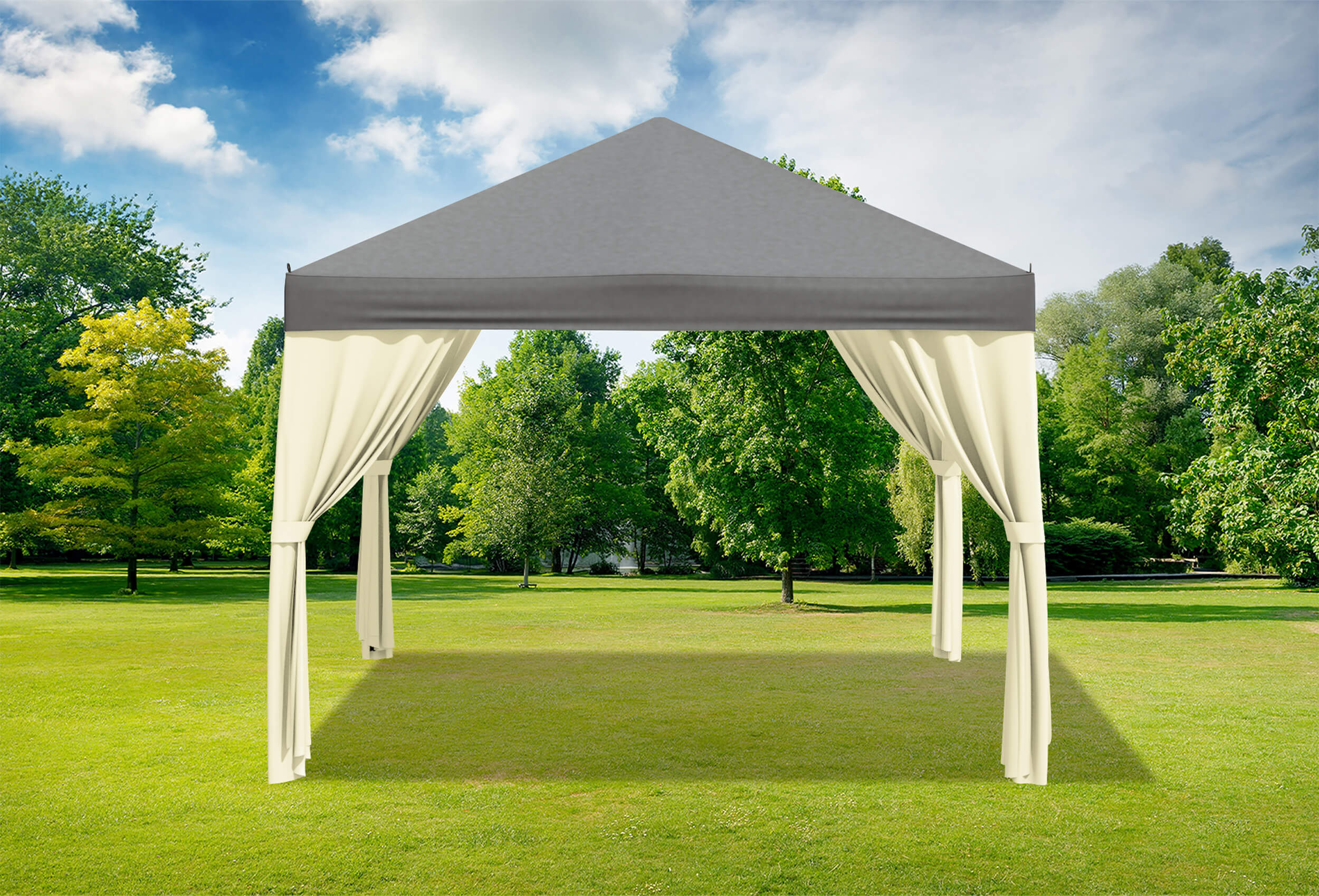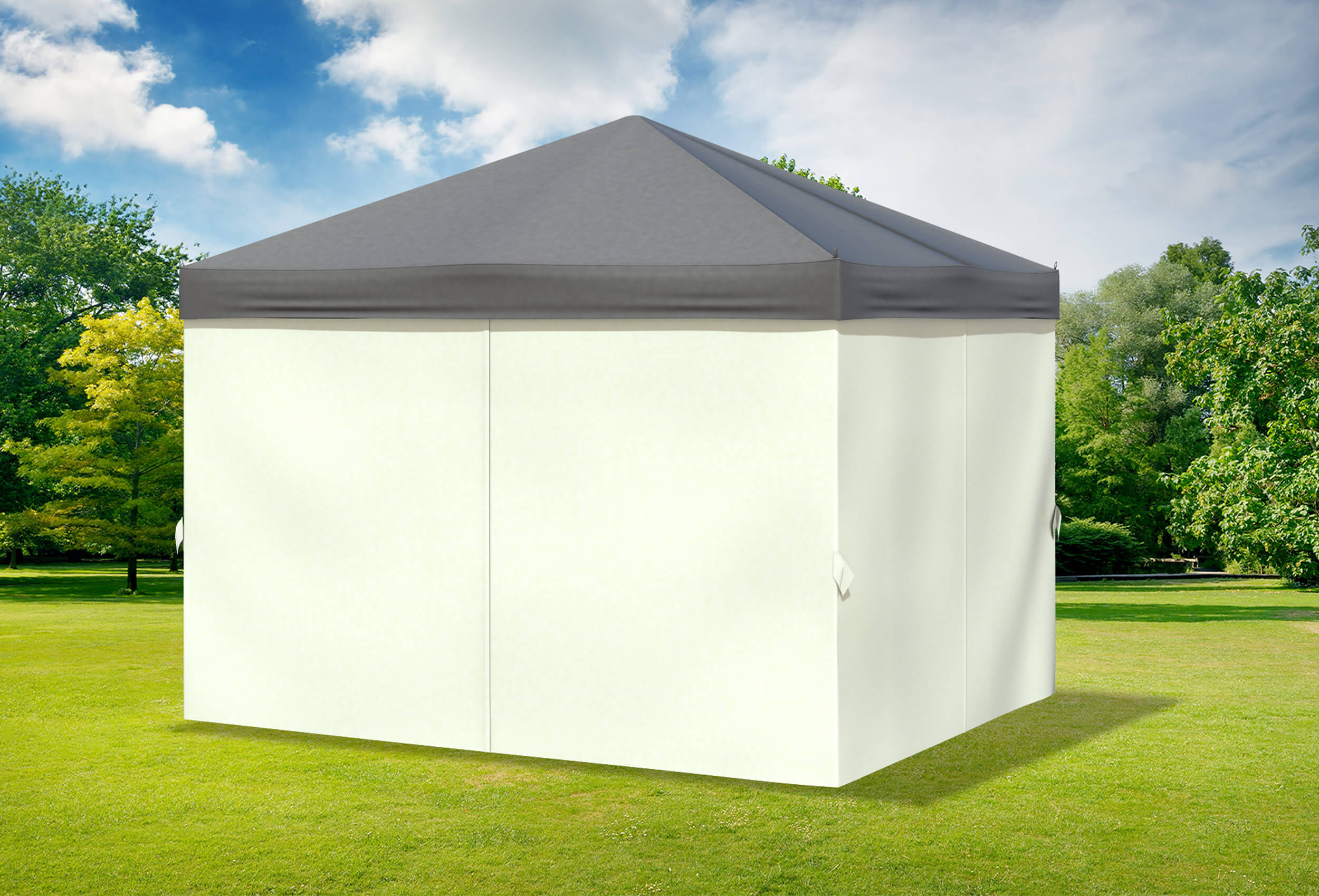 wirft weniger Falten und "raschelt" nicht im Wind 4 Seitenteile die als Schal gerafft und an den Standfußstangen fixiert werden können Das Zelt kann komplett verschlossen werden Seitenteile werden einfach per Klettverschluss an den horizontalen Stangen fixiert