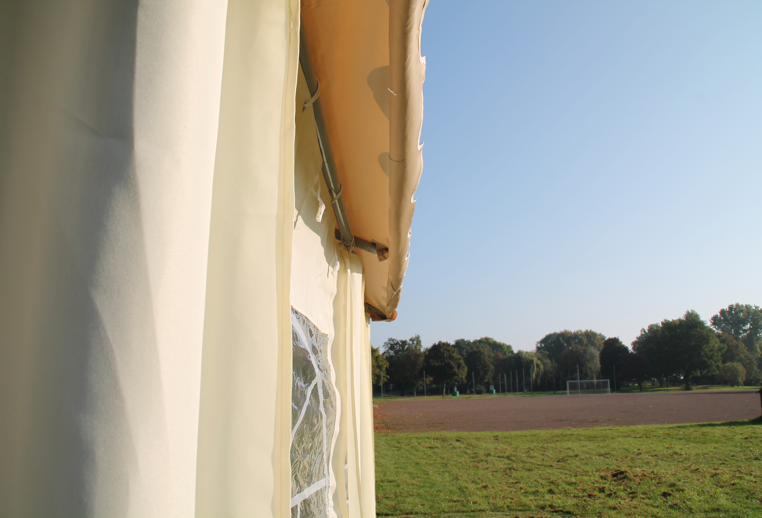 bewusster Verzicht auf zusätzliche Klettverschluss-Verbindungen Große Panoramafenster sorgen für ein lichtdurchflutetes Zelt Alle Planenteile schließen am Boden ab und können mit den mitgelieferten Planenerdhaken im Boden gesichert werden