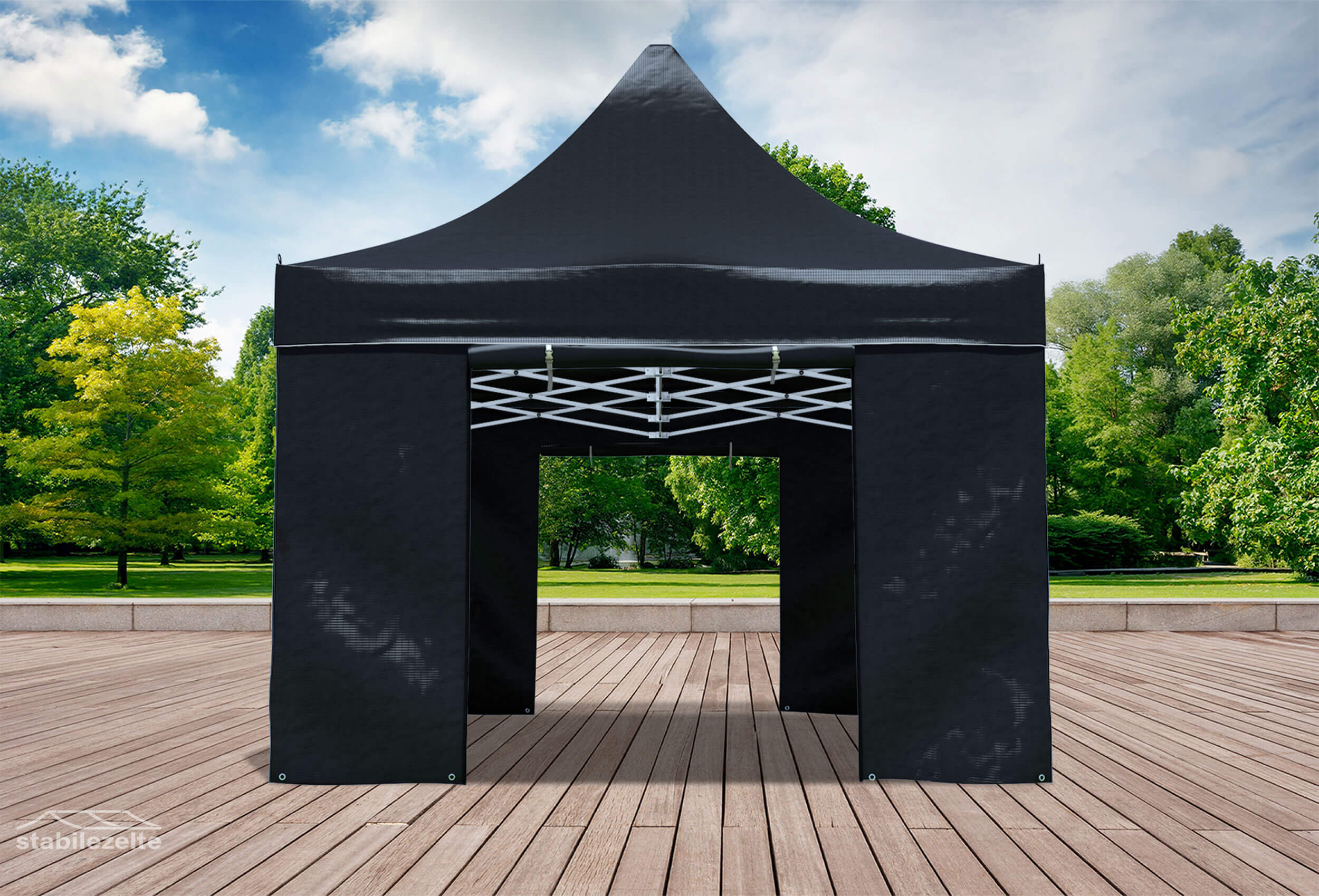 vergleichbar mit LKW-Plane - glänzend glatte Oberfläche Umlaufende Industrie-Klettverbindung zur leichten Fixierung der Seitenteile direkt an der Dachplane Seitenteile mit Profi-Reißverschlüssen winddicht koppelbar - Zusätzlicher Klett zur Fixierung an Standfußstangen Stabile Klarsicht PVC-Fenster sorgen für ein lichtdurchflutetes Zelt und können bei Bedarf von innen blickdicht verschlossen werden