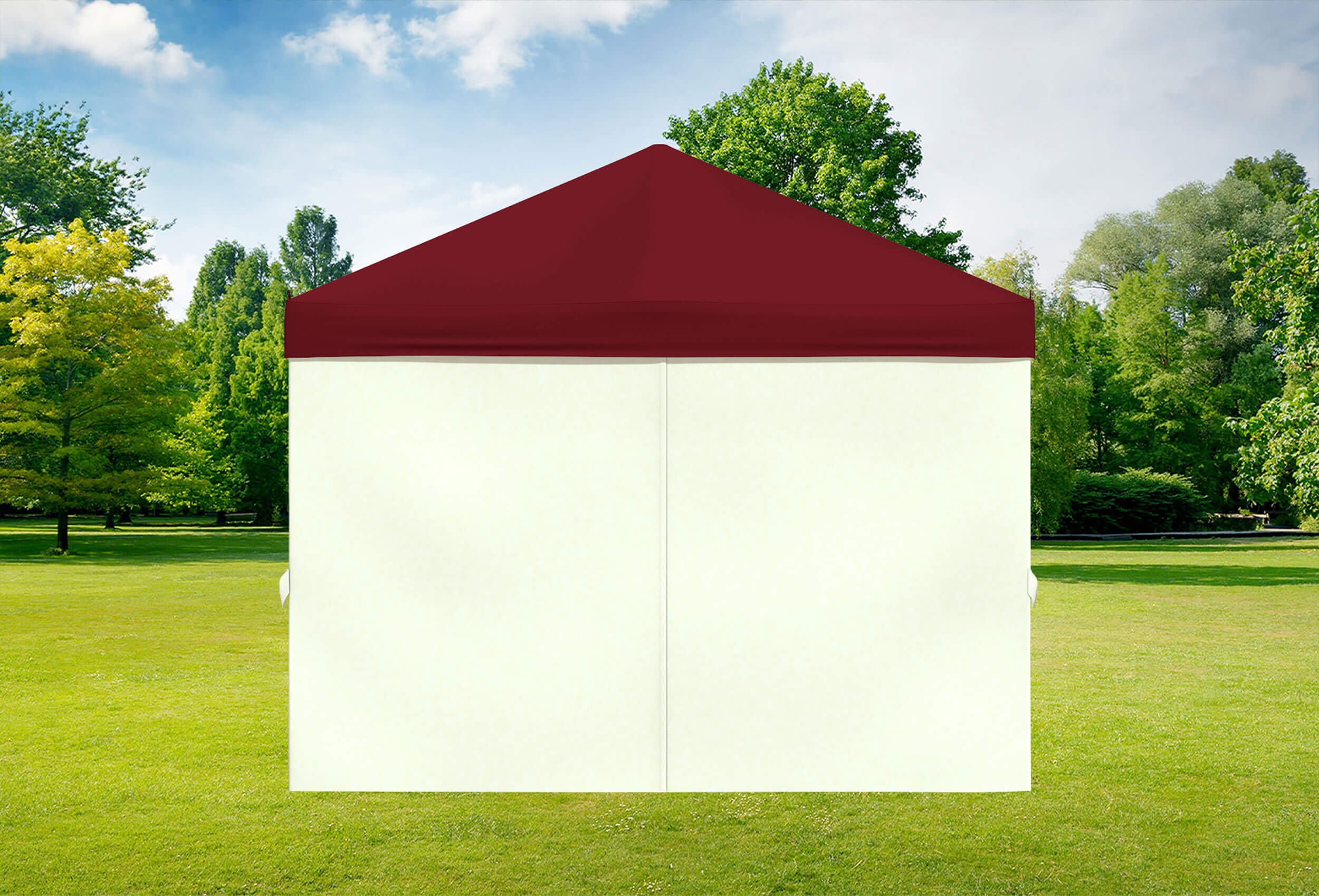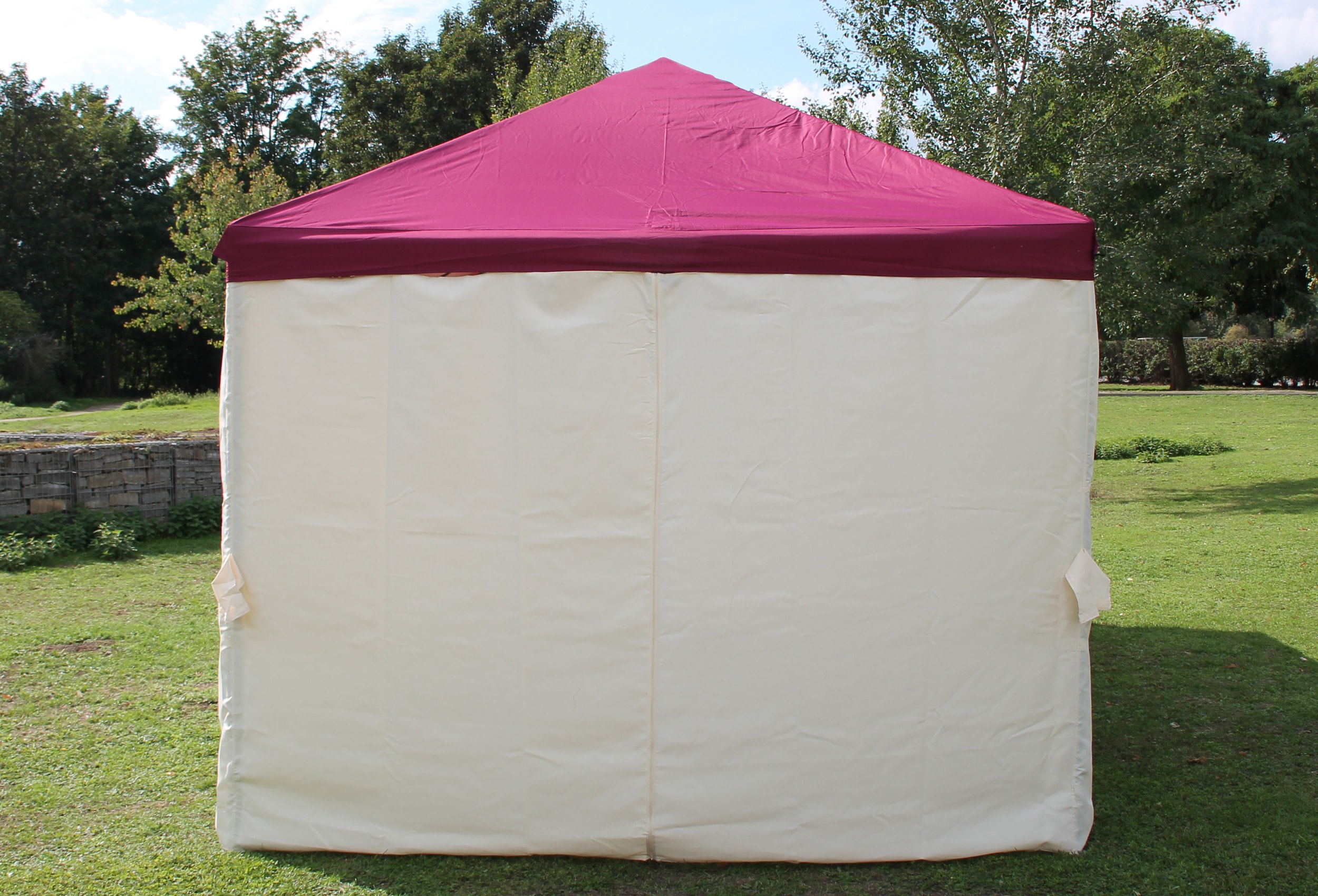 wirft weniger Falten und "raschelt" nicht im Wind 6 Seitenteile die als Schal gerafft und an den Standfußstangen fixiert werden können Das Zelt kann komplett verschlossen werden Seitenteile werden einfach per Klettverschluss an den horizontalen Stangen fixiert