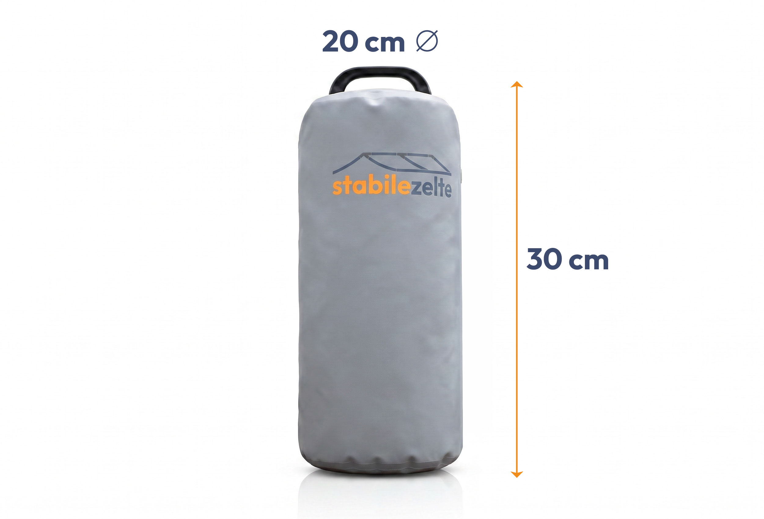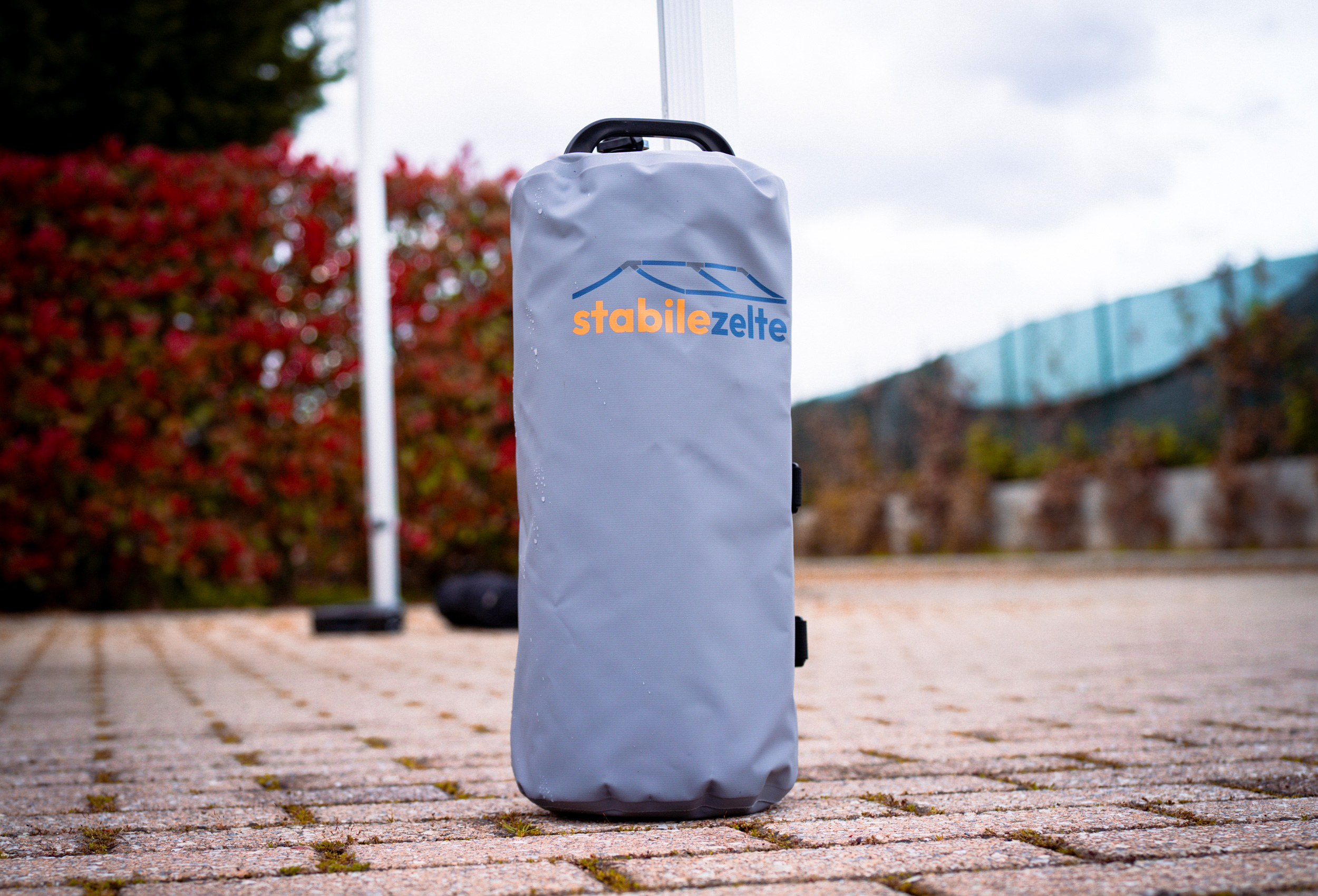 Sie haben keine Möglichkeit Ihr Zelt mit Heringen im Boden zu fixieren? Dann sind die Wassertaschen genau das Richtige für Sie. Einfach die Taschen mit Wasser befüllen und mittels der Klettverschlüsse am Gestänge fixieren. Sie erreichen ein Gewicht von ca. 10 kg pro Beschwerungstasche mit Wasser befüllt.